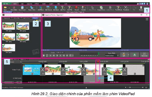 Hình 29.2 là giao diện phần mềm làm phim mà Nam sử dụng để thực hiện đoạn phim “Kì nghỉ hè đáng nhớ”. Quan sát và chỉ ra: