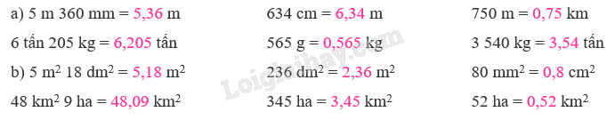 b) Trong bảng đơn vị đo diện tích, đơn vị bé bằng $\frac{1}{{100}}$ đơn vị lớn hơn tiếp liền.