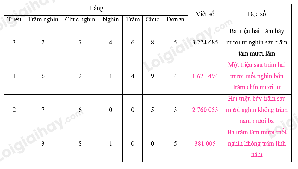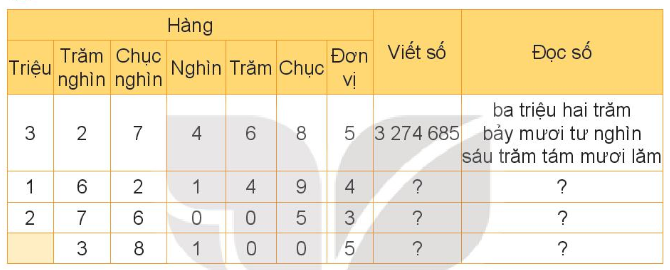 Viết số: Viết các chữ số của hàng triệu, hàng trăm nghìn, hàng chục nghìn, hàng nghìn, hàng trăm, hàng chục, hàng đơn vị lần lượt từ trái sang phải.