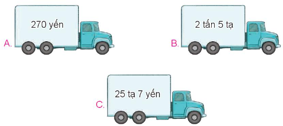 b) Đổi số cân nặng hàng hóa trên mỗi ô tô sang đơn vị là “yến” rồi so sánh.