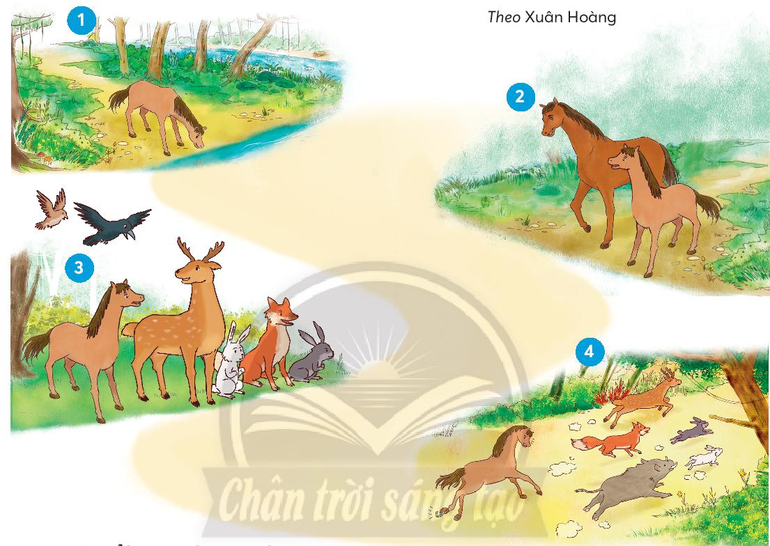 3. Cuộc thi đã đến. Sáng sớm, bãi cỏ đông nghẹt. Chị em nhà hươu sốt ruột gặm lả, Thỏ trắng, thỏ xóm thận trọng ngắm nghía các đối thủ. Bác quạ bay đi bay lại giữ trật tự. Ngựa con ung dung bước vào vạch xuất phát.