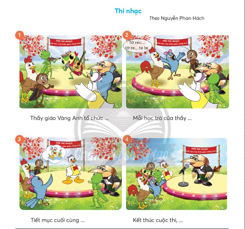 Em hãy nhớ lại câu chuyện “Thi nhạc” đã nghe cô đọc cùng với các bức tranh và từ ngữ gợi ý để kể lại nội dung chính của câu chuyện.