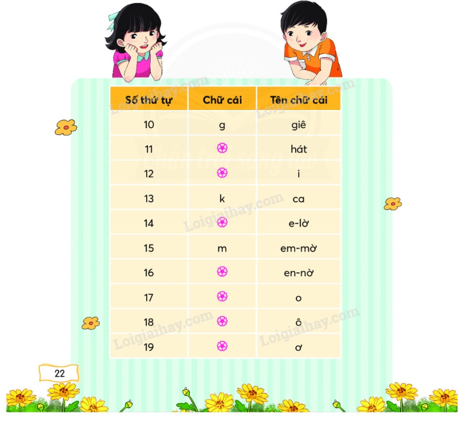 b. Tìm chữ cái thích hợp với mỗi ô hoa. Học thuộc tên các chữ cái trong bảng.