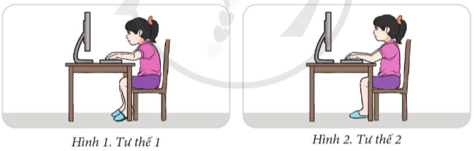 Khi dùng máy tính, nếu em nhìn sát vào màn hình hoặc ngồi quá lâu thì có thể gây hại cho sức khỏe như thế nào? Theo em, trong các Hình 1 và 2, hình nào thể hiện tư thế ngồi đúng khi làm việc với máy tính? Nếu em ngồi sai tư thế, sẽ có tác hại gì?