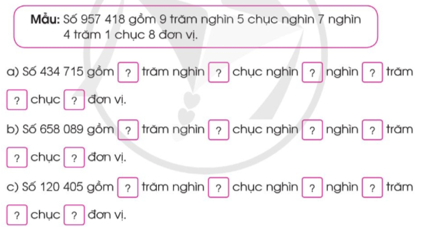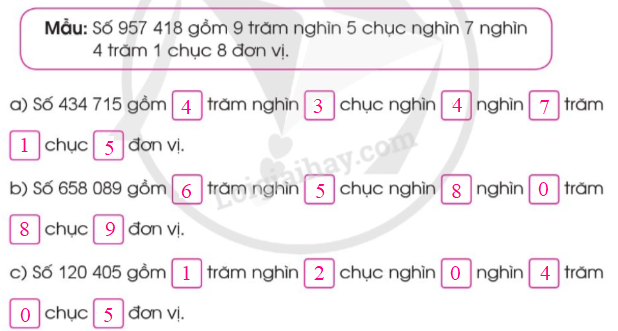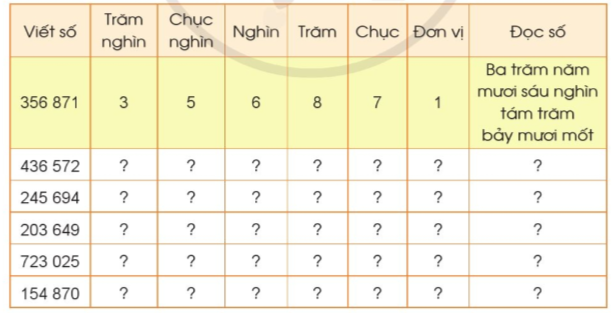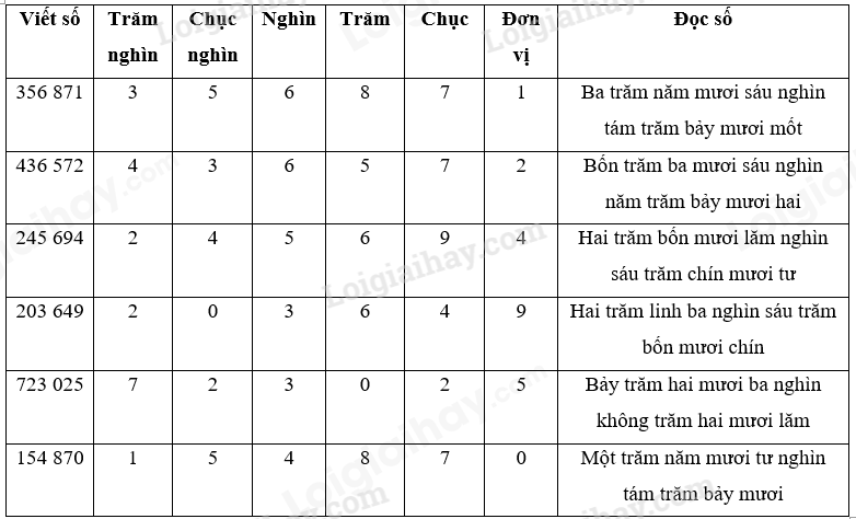 Đọc số hoặc viết số có 6 chữ số lần lượt từ hàng trăm nghìn, hàng chục nghìn, hàng nghìn, hàng trăm, hàng chục, hàng đơn vị.