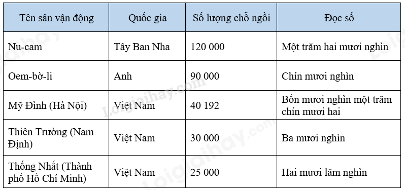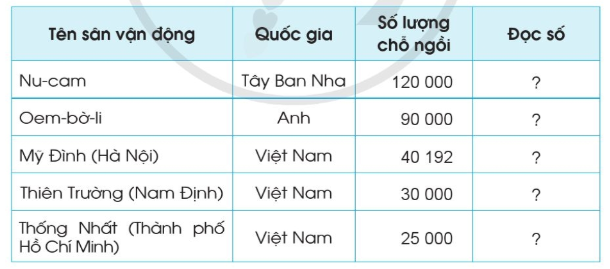 Đọc các số nói về sức chứa của một số sân vận động trên thế giới được thống kê trong bảng dưới đây: