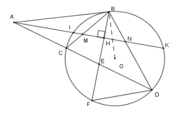 Từ \(A\) ở ngoài \(\left( O \right)\) vẽ tiếp tuyến \(AB\) và cát tuyến \(ACD\) . Tia phân giác \(\widehat {BAC}\) cắt \(BC,BD\) lần lượt tại \(M,N\) . Vẽ dây \(BF\) vuông góc với \(MN\) tại \(H\) và cắt \(CD\) tại \(E\) .