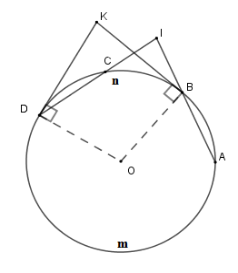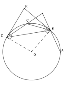 Trên đường tròn \(\left( {O;R} \right)\) vẽ ba dây liên tiếp bằng nhau \(AB = BC = CD\), mỗi dây có độ dài nhỏ hơn \(R\). Các đường thẳng \(AB,CD\) cắt nhau tại \(I\), các tiếp tuyến của \(\left( O \right)\) tại \(B\) và \(D\) cắt nhau tại \(K\) .