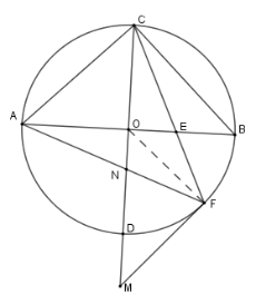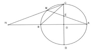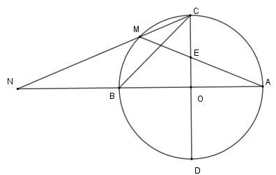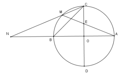 Cho \(\left( {O;R} \right)\) có hai đường kính \(AB,CD\) vuông góc với nhau. Gọi \(M\) là điểm chính giữa cung \(BC\) . Dây \(AM\) cắt \(OC\) tại \(E\) , dây \(CM\) cắt đường thẳng \(AB\) tại \(N\) .