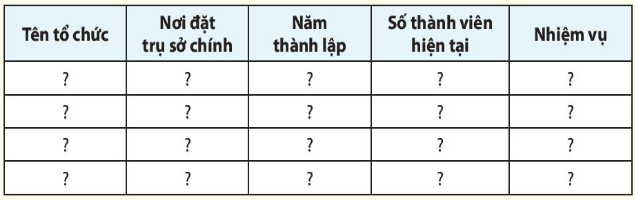 Hãy hoàn thành thông tin về một số tổ chức khu vực và quốc tế theo bảng sau vào vở.