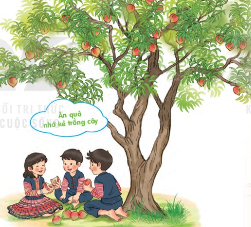 Các bạn nhỏ đang làm gì. Em hiểu câu “Ăn quả nhớ kẻ trồng cây” ý nói gì. Đọc. Tìm ở cuối các dòng thơ những tiếng cùng vần với nhau. Bài đồng dao nhắc chúng ta cần nhớ ơn những ai. Vì sao chúng ta cần nhớ ơn họ. Còn em, em nhớ ơn những ai. Vì sao. Học thuộc lòng bài đồng dao. Nói việc em cần làm để thể hiện lòng biết ơn đối với người thân hoặc thầy cô.