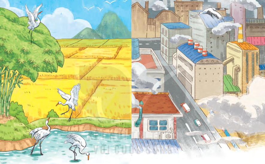 Trong bức tranh thứ hai: Thành phố với nhiều ngôi nhà san sát nhau. Những nhà máy thải khói ra ngoài môi trường. Bầu trời đục ngầu. Cò sải cánh bay đi.