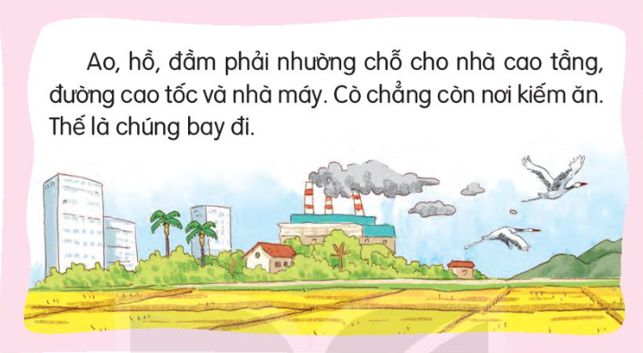Bây giờ, ao, hồ, đầm phải nhường chỗ cho những tòa nhà cao vút, những con đường cao tốc, những nhà máy tỏa khói mịt mù. Cò chẳng còn nơi kiếm ăn. Cò sợ những âm thanh ồn ào. Thế là chúng bay đi.