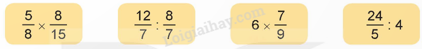 $6 \times \frac{7}{9} = \frac{{42}}{9} = \frac{{14}}{3}$                                                                                                          $\frac{{24}}{5}:4 = \frac{{24}}{5} \times \frac{1}{4} = \frac{{24}}{{20}} = \frac{6}{5}$