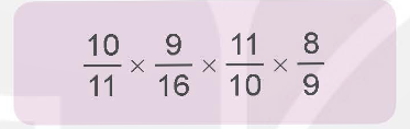 $\frac{5}{8} \times \frac{8}{{15}} = \frac{{40}}{{120}} = \frac{1}{3}$                                          $\frac{{12}}{7}:\frac{8}{7} = \frac{{12}}{7} \times \frac{7}{8} = \frac{{12 \times 7}}{{7 \times 8}} = \frac{{4 \times 3 \times 7}}{{7 \times 4 \times 2}} = \frac{3}{2}$