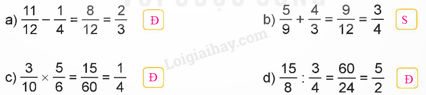 Thực hiện các phép tính, nếu đúng ghi Đ, nếu sai ghi S.