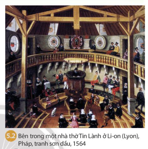 Theo em, tư liệu 5.2 và 5.3 thể hiện cải cách trong tôn giáo. Khi nhà thờ đạo Tin lành (hình 5.2) không có tranh ảnh, tượng thờ, ghế ngồi bằng gỗ cứng. Thể hiện sự giản tiện trong cách bài trí. Và giúp đỡ người nghèo (Theo tư liệu 5.3)