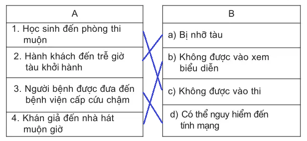 Giải câu 1, 2, 3, 4, 5, 6, 7 bài 5: Tiết kiệm thời giờ trang 19, 20, 21, 22 VBT Đạo Đức 4. Bài tập 1: Hãy nối mỗi trường hợp ở cột A với kết quả ở cột B cho phù hợp.