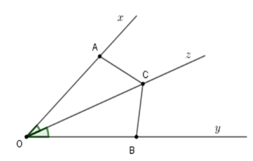 Cho góc nhọn $xOy$ và $Oz$  là tia phân giác của góc đó. Trên tia $Ox$  lấy điểm $A$  và trên tia $Oy$ lấy điểm $B$ sao cho $OA = OB.$ Gọi $C$ là một điểm bất kỳ trên tia $Oz.$