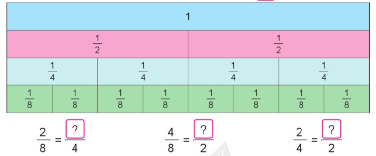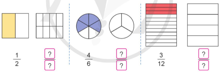 a) Quan sát hình vẽ, nêu các cặp phân số bằng nhau: Quan sát hình vẽ, nêu số thích hợp vào ô trống?