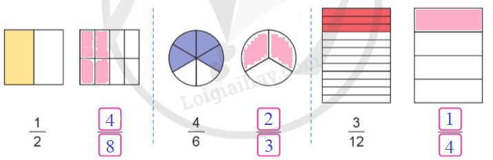b) Quan sát hình vẽ để viết phân số bằng với phân số còn lại trong mỗi cặp hình.