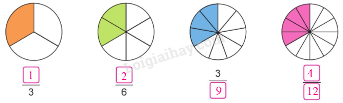 Viết số thích hợp vào ô trống để tạo thành phân số chỉ số phần được tô màu.
