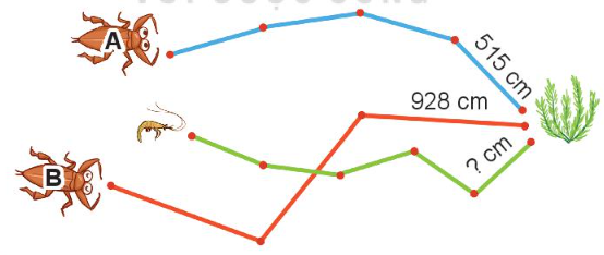 Quãng đường bơi của tôm là đường gấp khúc gồm 5 đoạn dài bằng nhau. Biết quãng đường tôm bơi dài bằng quãng đường bơi của cà cuống A. Mỗi đoạn của đường gấp khúc đó dài ?  cm.