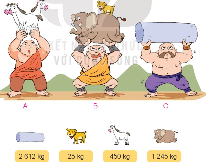 Tính cân nặng vật mà mỗi người khổng lồ nâng lên rồi so sánh kết quả cân nặng.