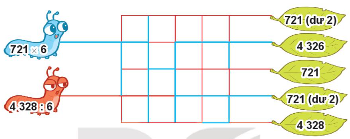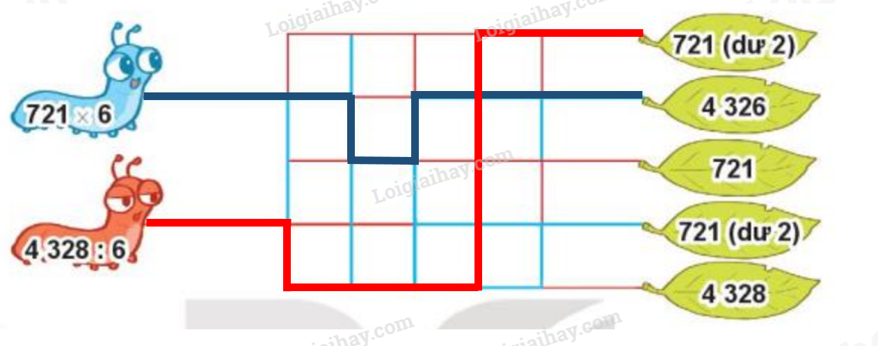 Mỗi chú sâu sẽ đi theo đường nào để đến chiếc lá là ngôi nhà của mình? Biết rằng mỗi chú sâu chỉ bò theo đường có màu trùng với màu của nó và sâu cũng chỉ bò đến chiếc lá ghi kết quả của phép tính trên mình chú sâu đó.