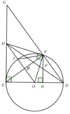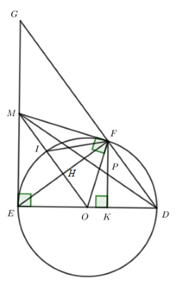 Vì  MF  là tiếp tuyến của \(\left( O \right)\) nên  MF  vuông góc với OF, suy ra tam giác MOF nội tiếp đường tròn đường kính MO  (2)