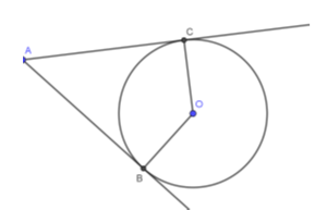 Vì hai tiếp tuyến của đường tròn \(\left( O \right)\) cắt nhau tại \(A\) nên \(\widehat {ACO} = \widehat {ABO} = {90^0} \Rightarrow \widehat {CAB} + \widehat {COB} = {360^0} – {180^0} = {180^0}\)
