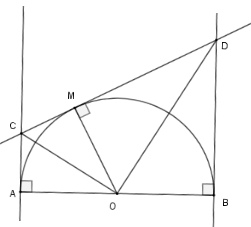 Cho nửa đường tròn tâm $O$, đường kính $AB$. Vẽ các tiếp tuyến $Ax,By$ với nữa đường tròn cùng phía đối với $AB$. Từ điểm $M$ trên nửa đường tròn ($M$ khác $A,B$ ) vẽ tiếp tuyến với nửa đường tròn, cắt $Ax$ và $By$ lần lượt tại $C$ và $D$ .