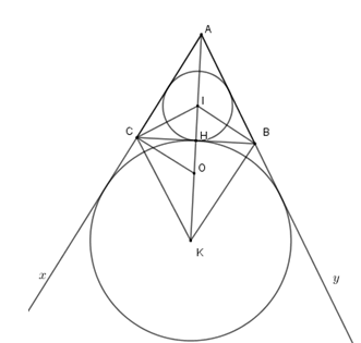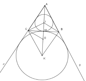 Cho tam giác $ABC$ cân tại $A$, $I$ là tâm đường tròn nội tiếp, $K$ là tâm đường tròn bàng tiếp trong góc $A.$ Gọi $O$ là trung điểm của $IK.$