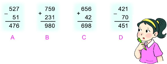 Kiểm tra ta thấy Mai đã làm đúng phép tính A, C và làm sai phép tính B, D.