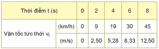 + Gia tốc trong đoạn đường 2: \(a = \frac{{\Delta v}}{{\Delta t}} = \frac{{\frac{{145}}{{18}} – \frac{{25}}{{18}}}}{{4 – 1}} \approx 2,22(m/{s^2})\)