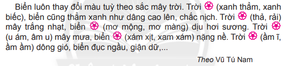 Biển luôn thay đổi màu tùy theo sắc mây trời. Trời xanh thẳm, biển cũng thẳm xanh như dâng cao lên, chắc nịch. Trời rải mây trắng nhạt, biển mơ màng dịu hơi sương. Trời âm u mây mưa, biển xám xịt nặng nề. Trời ầm ầm dông gió, biển đục ngầu, giận dữ…