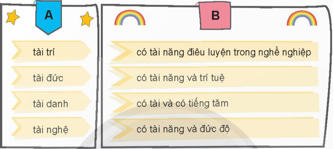 Chọn mỗi lời giải nghĩa ở cột B với một từ phù hợp ở cột A. Tìm thêm 2 – 3 từ chứa tiếng tài có nghĩa là giỏi. Chọn từ phù hợp trong ngoặc đơn thay cho mỗi chỗ trống. Viết đoạn văn ngắn nói về tài năng của một nhân vật mà em đã học.