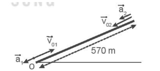 Xét chuyển động của xe đạp, ta có: v02 = -2 m/s; d02 = 570 m; a2 = -0,2 m/s2.