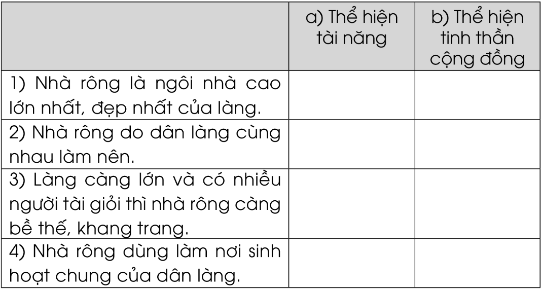 Vì sao có thể nói nhà rông là nơi thể hiện tài năng và tinh thần cộng đồng của người dân Tây Nguyên? Đánh dấu tích vào ô phù hợp:
