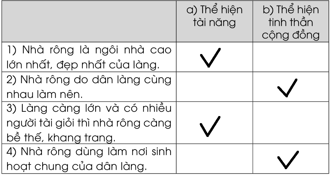 Vì sao có thể nói nhà rông là nơi thể hiện tài năng và tinh thần cộng đồng của người dân Tây Nguyên? Đánh dấu tích vào ô phù hợp: