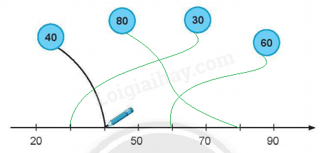 Ta thấy mỗi khoảng chia trên tia số là 10 đơn vị. Từ đó ta nối các số với tia số cho thích hợp.