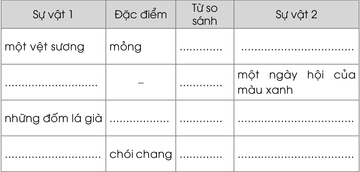 3. Xếp các hình ảnh so sánh trong đoạn văn Rừng xuân vào bảng dưới đây:
