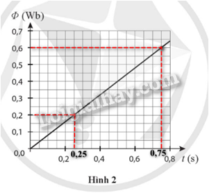 Một khung dây được đặt trong từ trường đều có độ lớn cảm ứng từ là B. Hình 2 biểu diễn từ thông qua khung dây theo thời gian. Tính độ lớn của suất điện động cảm ứng xuất hiện trong khung dây.