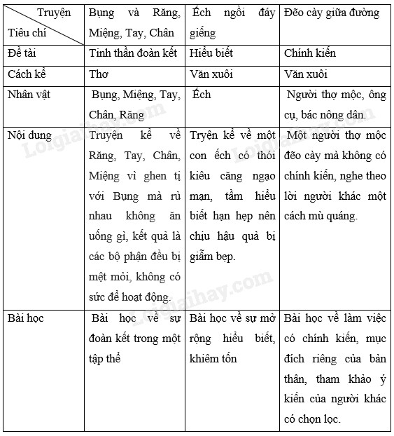Đối chiếu với khái niệm truyện ngụ ngôn ở phần Kiến thức ngữ văn để nêu ra sự giống nhau và khác nhau giữa truyện ngụ ngôn này với các truyện ngụ ngôn đã học (Gợi ý: có thể dựa vào các yếu tố đề tài, cách kế, nhân vật, nội dung, bài học,…).