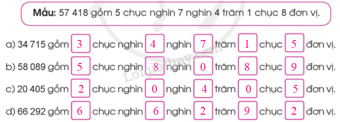 Xác định chữ số hàng chục nghìn, hàng nghìn, hàng trăm, hàng chục, hàng đơn vị rồi viết số còn thiếu vào chỗ trống.
