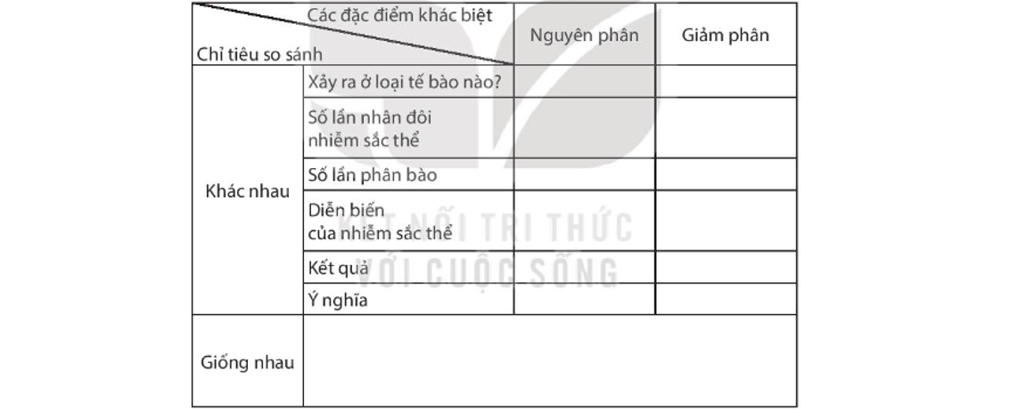 Lập và hoàn thành bảng so sánh quá trình nguyên phân với quá trình giảm phân theo mẫu sau: