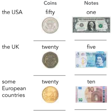 The British pound is one of the oldest currencies in the world. There are notes for 5, 10, 20, and 50 pounds. The new notes are plastic, not paper. There are lots of coins: 1, 2, 5, 10, 20, and 50 pence. You can say ‘pence’ or ‘p’. The other coins are 1 pound and 2 pounds.