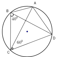 $\begin{array}{l}\widehat {CAD} + \widehat {ACD} + \widehat {ADC} = {180^0}\\ \Rightarrow \widehat {ADC} = {180^0} – \left( {\widehat {CAD} + \widehat {ACD}} \right) \\= {180^0} – \left( {{{40}^0} + {{60}^0}} \right) = {80^0}.\end{array}$