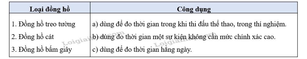 Câu 6: Hãy ghép tên các loại đồng hồ (ở cột bên trái) tương ứng với công dụng của các loại đồng hồ đó (ở cột bên phải).