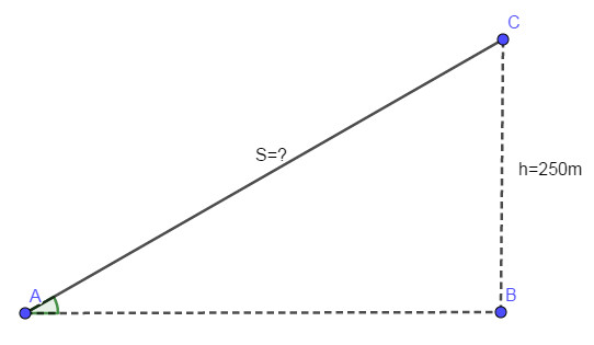 \(\Rightarrow AC = \dfrac{{BC}}{{\sin \left( {\angle CAB} \right)}} = \dfrac{h}{{\sin {{23}^o}}} = \dfrac{{250}}{{\sin {{23}^o}}} \approx 640\left( m \right)\)